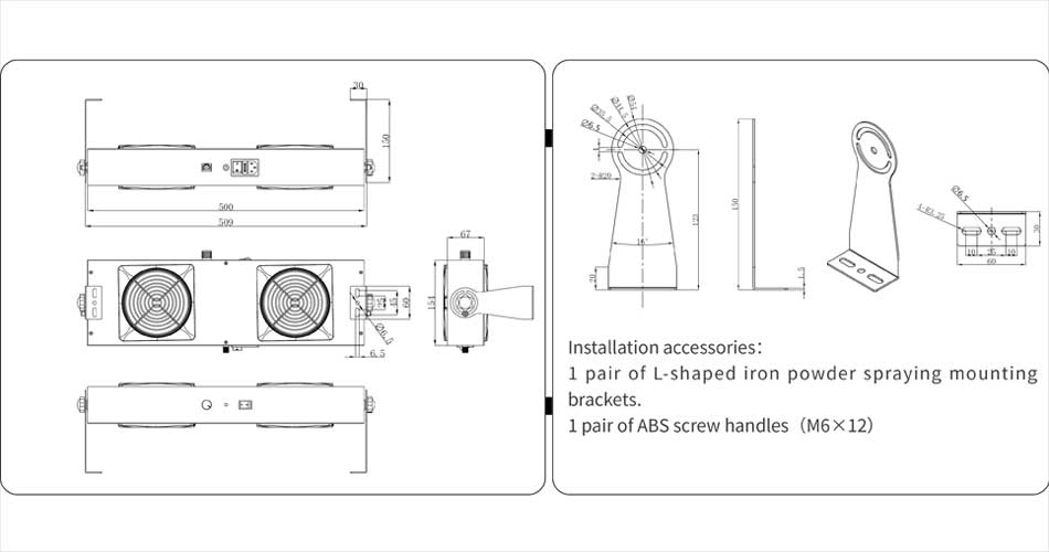 Installation accessories 1 pair of L-shaped iron powder spraying mounting brackets, 1 pair of bakelite screw handles(M5×8)
