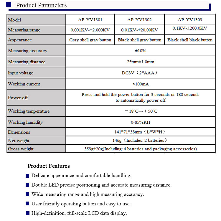 The AP-YV1301/1302/1303 type static meter is a test instrument developed by Anping Company to detect the electrostatic voltage on the surface of electrostatic objects. It uses non-contact measurement technology to influence the electrostatic field of the surface of the object. Minimized to ensure the accuracy of measurement, can be widely used in electronics, plastics, chemicals, printing, optoelectronics and other industries.