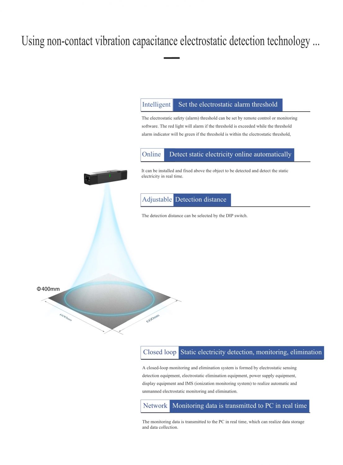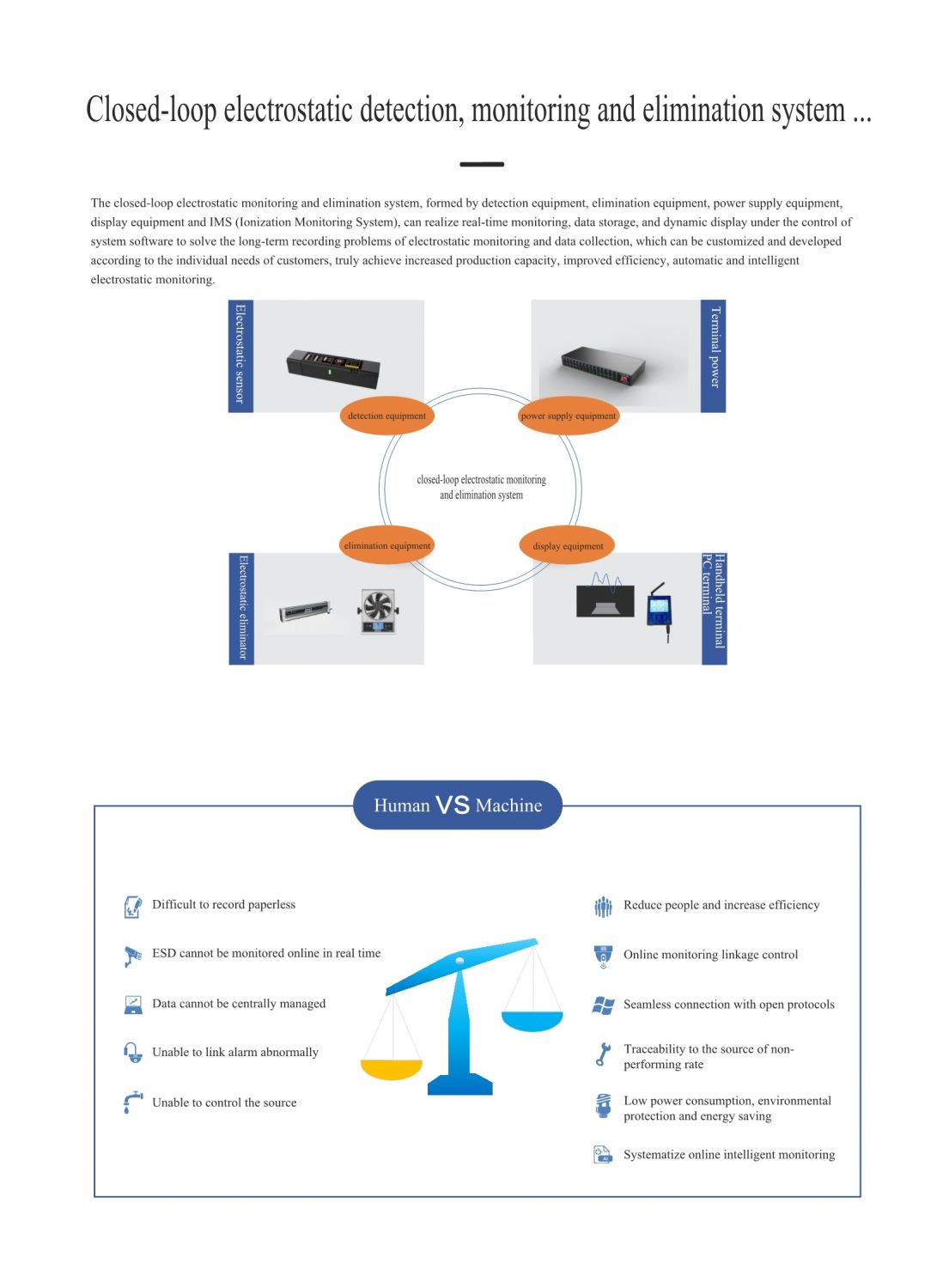 The closed-loop electrostatic monitoring and elimination system, formed by detection equipment, elimination equipment, power supply equipment, display equipment and IMS (Ionization Monitoring System), can realize real-time monitoring, data storage, and dynamic display under the control of system software to solve the long-term recording problems of electrostatic monitoring and data collection, which can be customized and developed according to the individual needs of customers, truly achieve increased production capacity, improved efficiency, automatic and intelligent electrostatic monitoring.